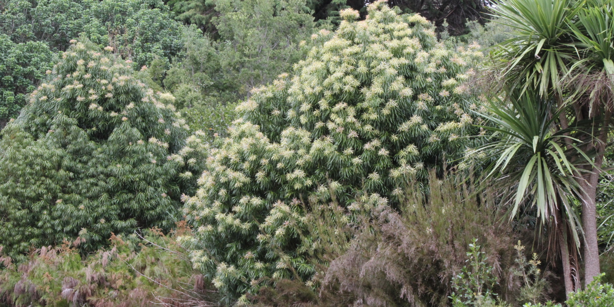 This collection complements other collections of ancient podocarps at the Gardens (Gondwana Arboretum and Conifer Collection). In Podocarp Valley the podocarps are planted with a collection of primitive flowering proteas and restios (also with fossil records back to Gondwana). From the family Restionaceae, restios are architectural evergreen rush or grass-like plants mostly from South Africa. If you are looking for a drought tolerant and low maintenance plant restios create unique rhythm and movement in a garden.